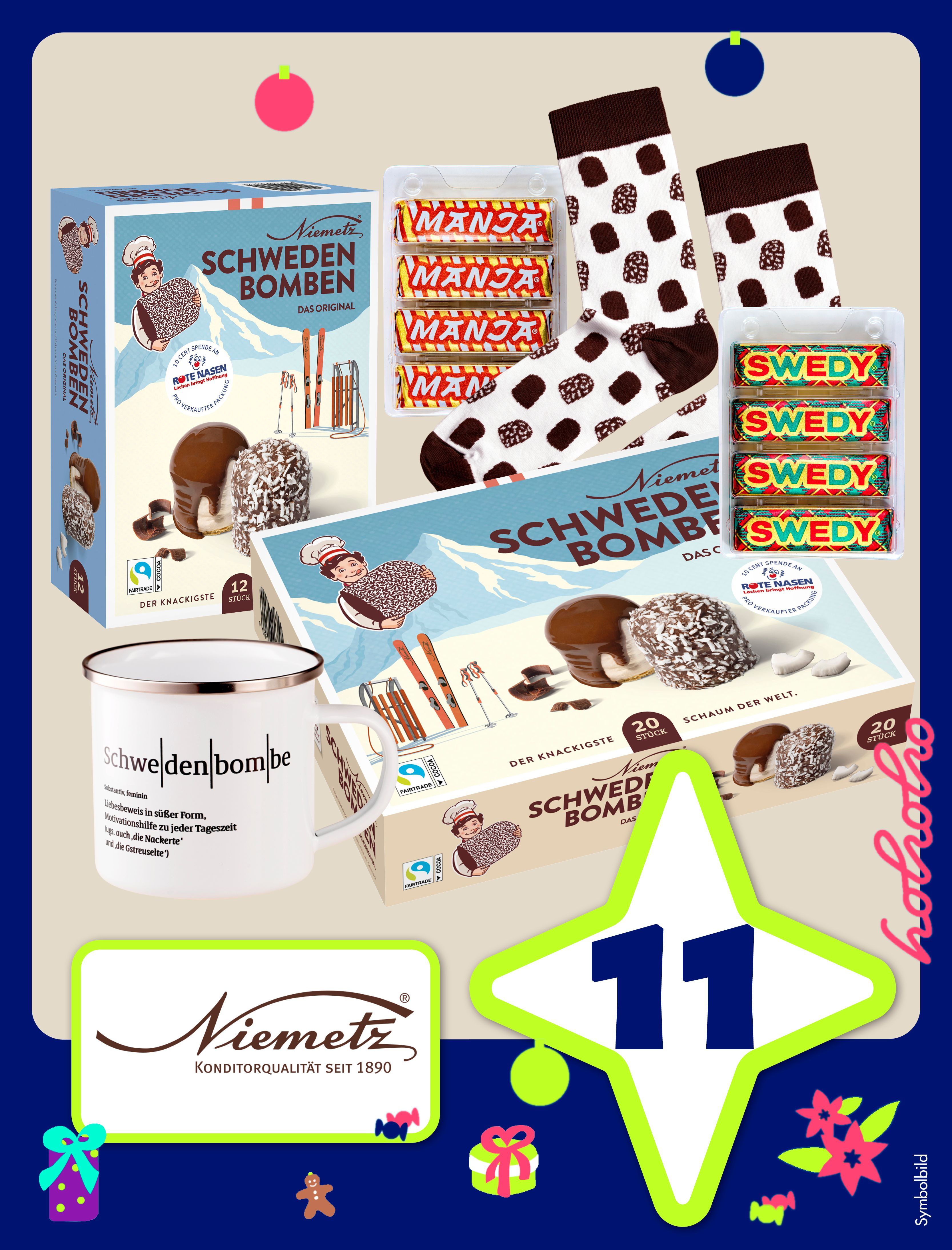 Die Kultmarken Schwedenbomben, Manja und Swedy versüßen den Österreicherinnen und Österreichern seit Jahrzehnten den Alltag und sind Teil der österreichischen Naschkultur. Darum verlosen wir heute ein Niemetz-Naschpaket: Während unsere geliebten Schwedenbomben mit ihrem fluffigen Schaum und der knackigen Glasur überzeugen, schmelzen Manja (Haselnuss) und Swedy (Erdnuss) förmlich im Mund. Gemeinsam mit den Schwedenbomben-Socken und der -Tasse kann man es sich zuhause gut gehen lassen und ein paar süße Verwöhnmomente gönnen.