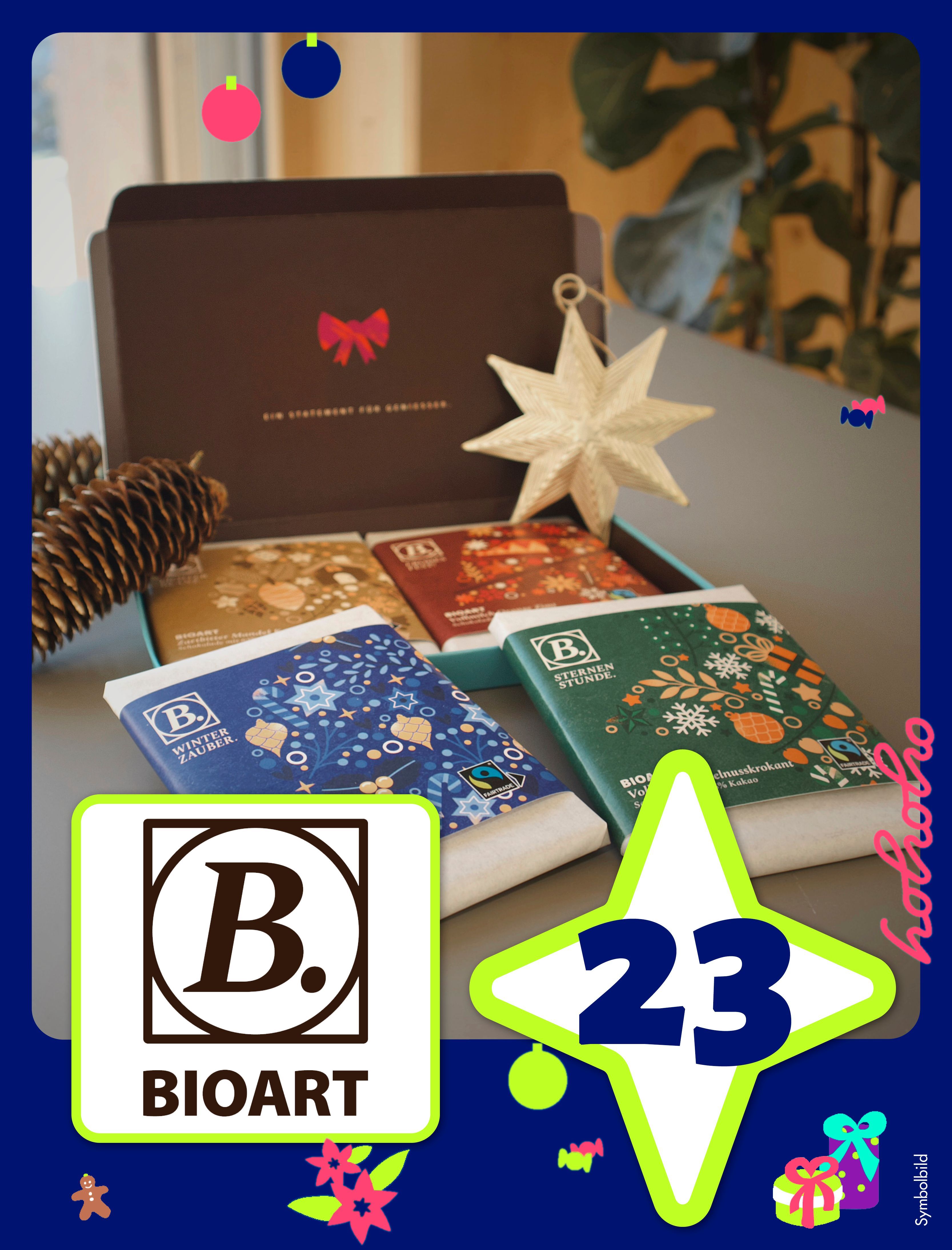 Drei Chancen auf einen Gewinn: Die weihnachtliche BioArt Schokobox enthält vier köstliche Bio- & FAIRTRADE-Schokoladen in festlichen Sorten: Vollmilch Haselnusskrokant, Vollmilch Orange Zimt, Zartbitter Kirsch und Zartbitter Mandel Karamell – liebevoll zusammengestellt für genussvolle Momente in der Adventszeit!