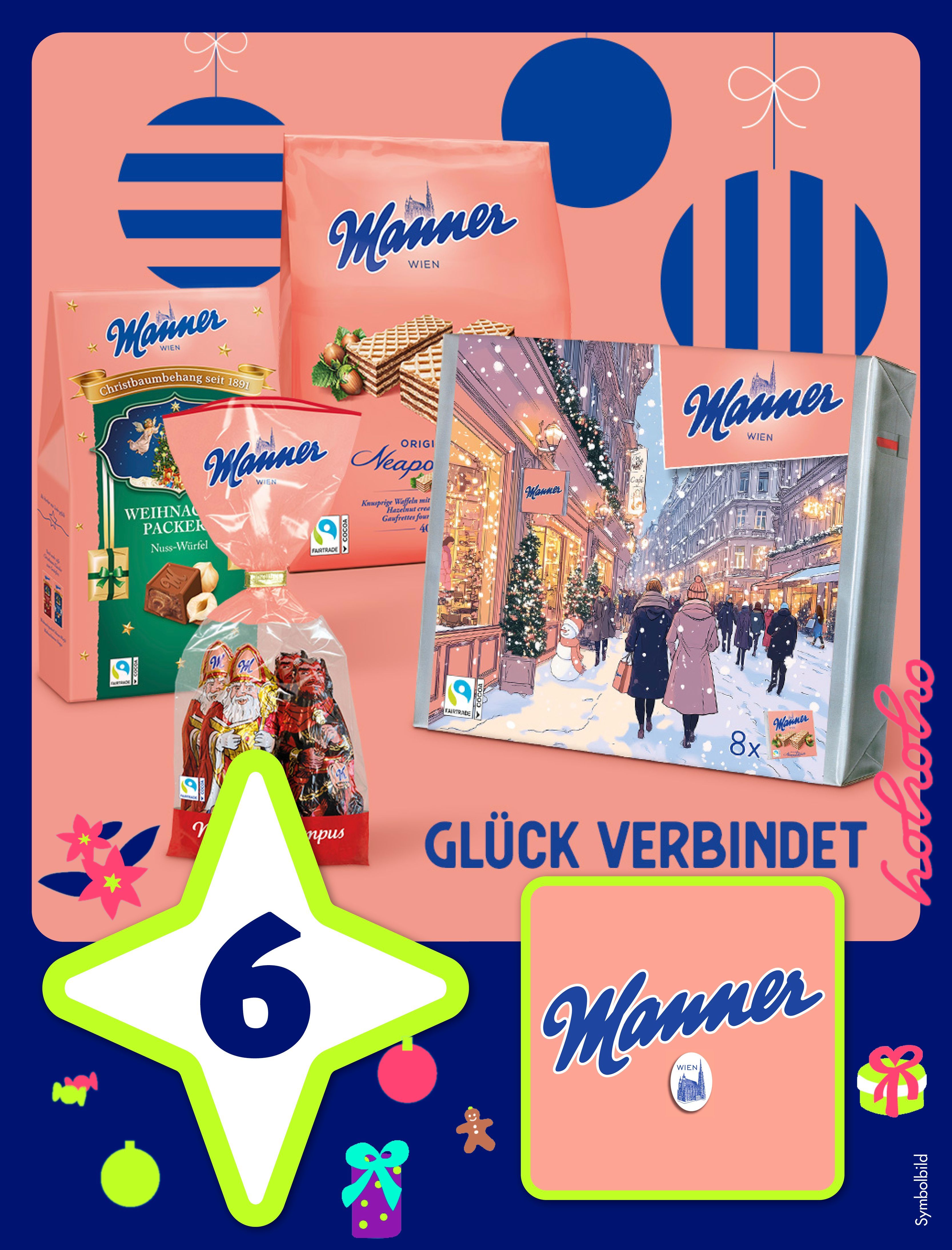 Mit ein bisschen Glück wird dein Advent heuer besonders süß: Gewinne eines von drei Manner-Paketen mit Original Neapolitaner Schnitten sowie Nikolo & Krampus aus feiner Schokolade! Jetzt beim Gewinnspiel mitmachen und rosa Weihnachtsfreude erleben - denn Glück verbindet!