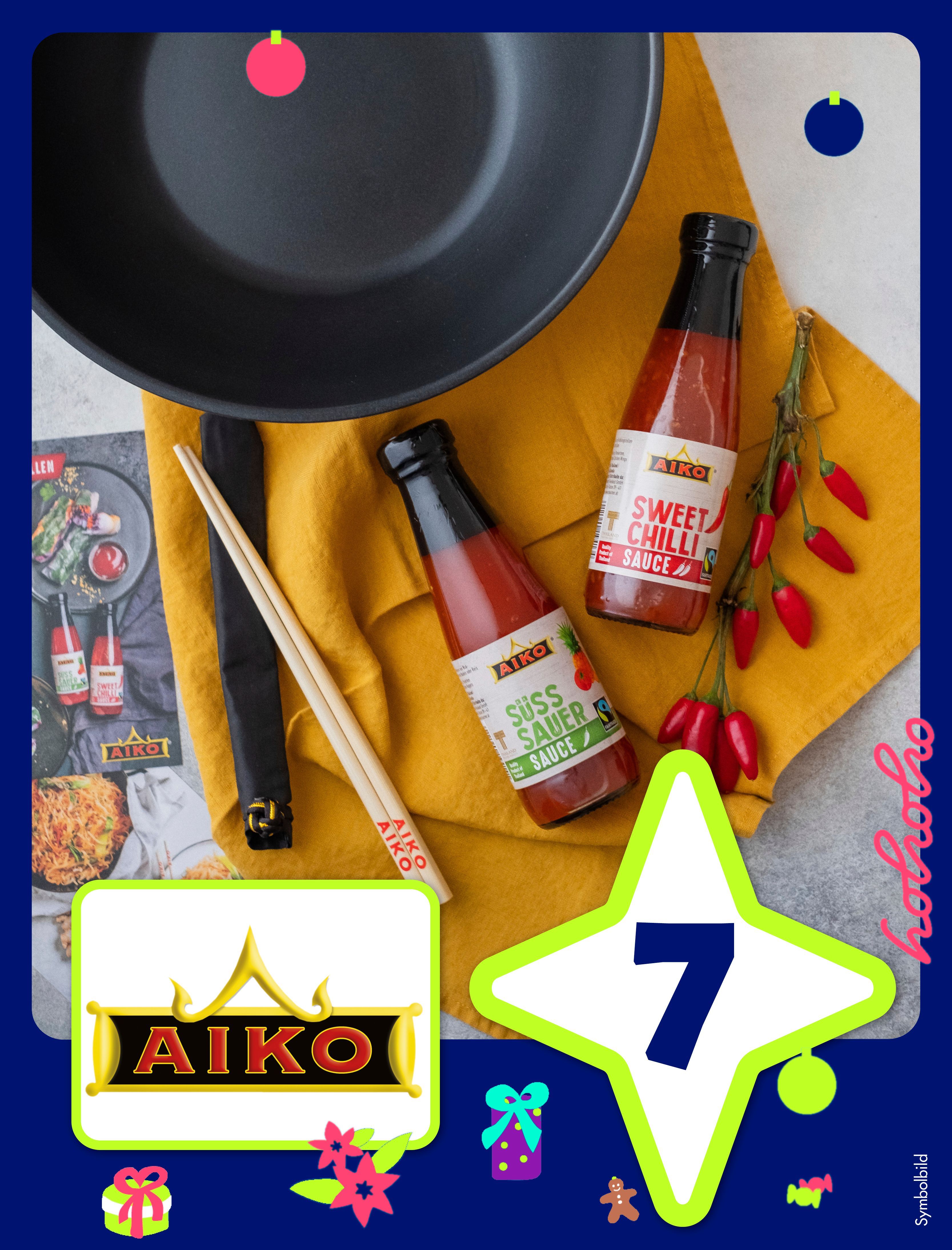Hol dir den Geschmack Thailands direkt in deine Küche: Gewinne eines von zwei FAIRTRADE-AIKO®-Kochsets mit AIKO® Süß Sauer Sauce und AIKO® Sweet-Chili-Sauce, Bambusstäbchen und einer hochwertigen Wokpfanne. Für authentischen Genuss wie in Thailand.