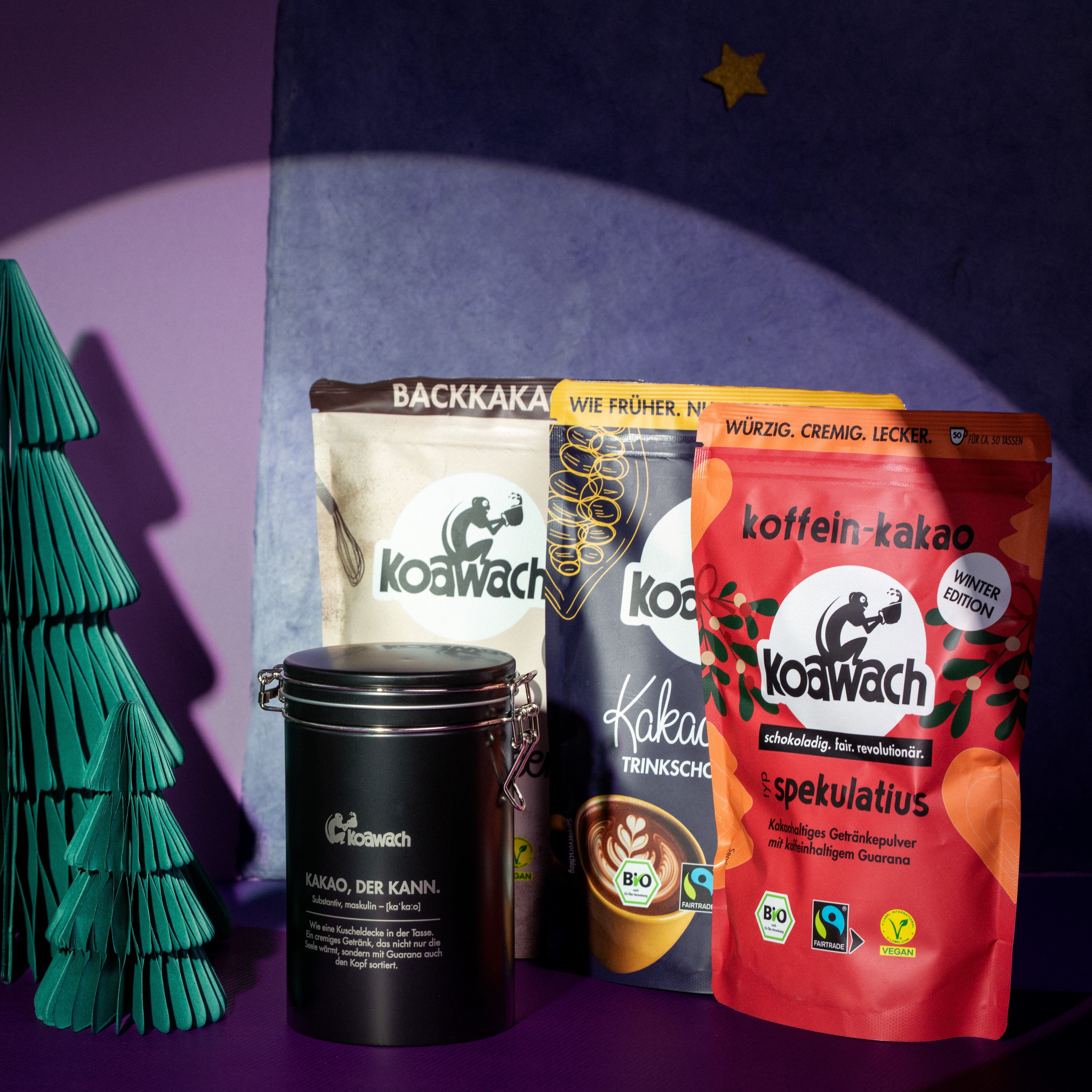 koawach steht für fairen Genuss mit gutem Gewissen. Seit Beginn setzen sie auf hochwertige, fair gehandelte Zutaten und arbeiten eng mit Fairtrade zusammen. So wird der nachhaltige Kakaoanbau unterstützt, bessere Arbeitsbedingungen gefördert und Produzent*innen vor Ort gestärkt. Die Produkte verbinden Genuss und Verantwortung: Vom koffeinfreien „Kakaoliebe“ über den vielseitigen Backkakao bis hin zu unserer festlichen Spekulatius-Edition – alle Sorten sind nicht nur köstlich, sondern auch ein Beitrag zu mehr Fairness im Handel. Mit koawach genießt du vollen Geschmack und tust gleichzeitig Gutes – für Mensch und Umwelt.